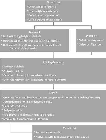 The CSI Open Application Programming Interface (OAPI) is utilized to assemble and run SAP2000 commands through MATLAB scripts. This enables an iterative design process, where structural design parameters are incrementally changed, and the structural model is analyzed for each incremental change. When first initialized, the primary MATLAB script, which serves as the main link between the user and SAP2000’s OAPI function, prompts the user to input various basic design parameters such as material definitions, building height and shear wall thickness. Based on this, the code generates the general building parameters. Next, he program next initializes a separate MATLAB function, named BuildingGeometry, to create the geometric layout of the building based on the user input. The BuildingGeometry script starts by assigning joint labels along the x and y directions. Next, the code assigns bay labels based on the joint labels assigned earlier. Finally, SAPAPI initiates the model formulation process using the output from BuildingGeometry. Once SAPAPI is run, the main script retrieves the necessary data and creates a results matrix, which is the graphically presented to the user using the plotter script.